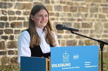 Souverän berichtete die Auszubildende Lotta Grünauer von ihren Eindrücken beim Entwurf des Gedenkzeichens und warum die Erfahrungen in der Zusammenarbeit mit dem Volksbund sie nachhaltig verändert haben. Ohne das „hätte ich nicht erfahren, wie Geschichte sich anfühlt, wenn man mitten drinsteht“ (Rede im Wortlaut).