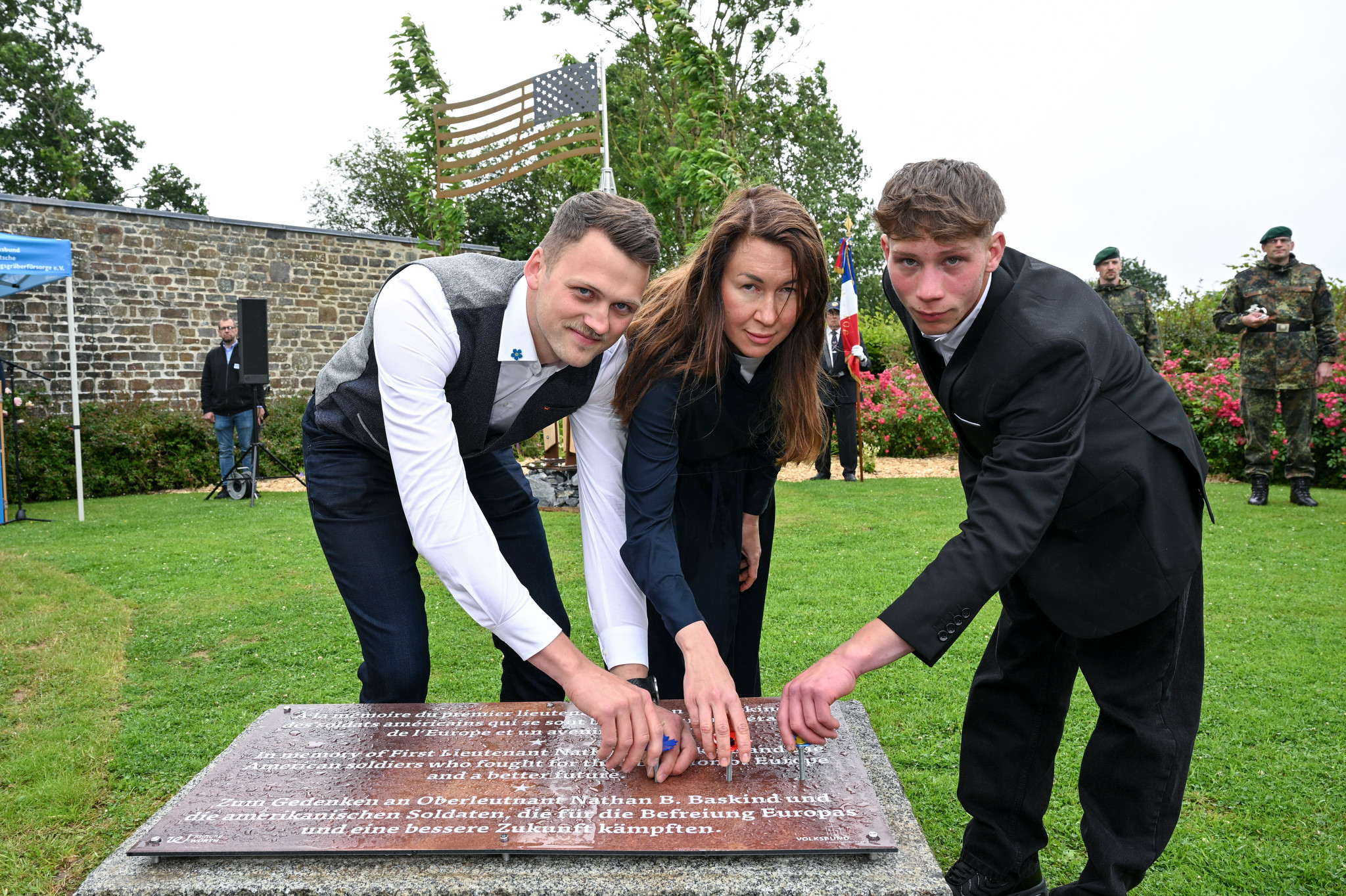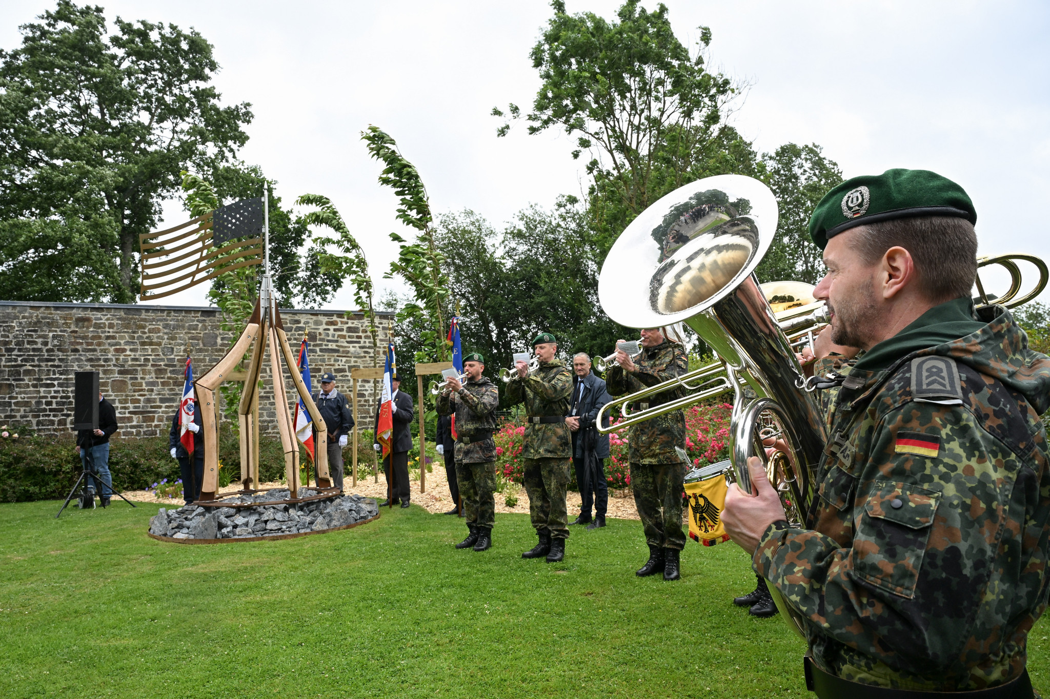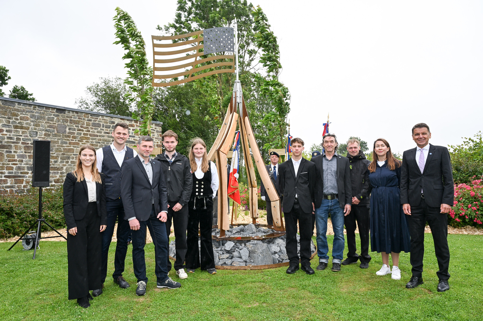 Unter großer öffentlicher Anteilnahme ist einen Tag vor dem 81. Jahrestag des D-Day am 6. Juni das mächtige Gedenkzeichen eingeweiht worden – an der Stelle, an der sich früher ein US-amerikanischer Soldatenfriedhof befand. Junge Frauen und Männern aus süddeutschen Handwerksbetrieben hatten das 3,5 Meter hohe und 360 Kilogramm schwere Mahnmal gefertigt. Es wurde mit Mitteln der Stiftung Würth finanziert. Die Stahlkonstruktion zeigt eine stilisierte amerikanische Flagge, die sich im Wind dreht.