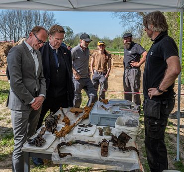 Am 7. April bekam das Projektteam hohen Besuch: Martin Kotthaus, deutscher Botschafter in Belgien, und Ben Weyts, stellvertretender Ministerpräsident der flämischen Regierung und flämischer Minister für Haushalt und Finanzen, flämische Peripherie, immobiles Kulturerbe und Tierschutz, besuchten den Einsatzort, begleitet von der Bürgermeisterin von Ypern, Katrien Desomer.