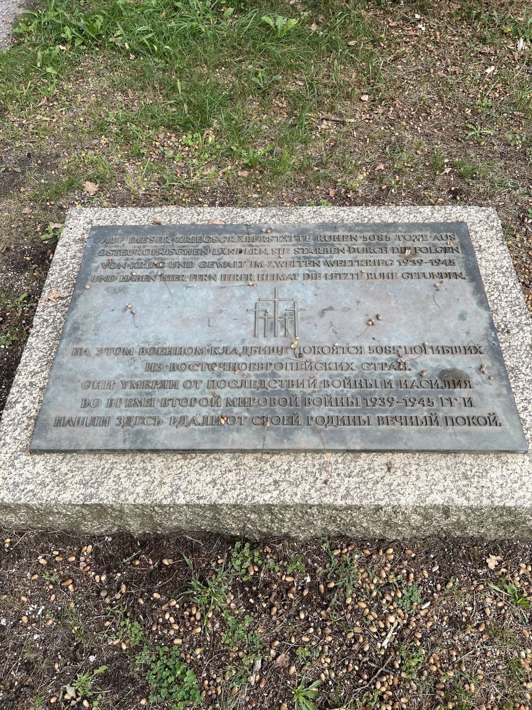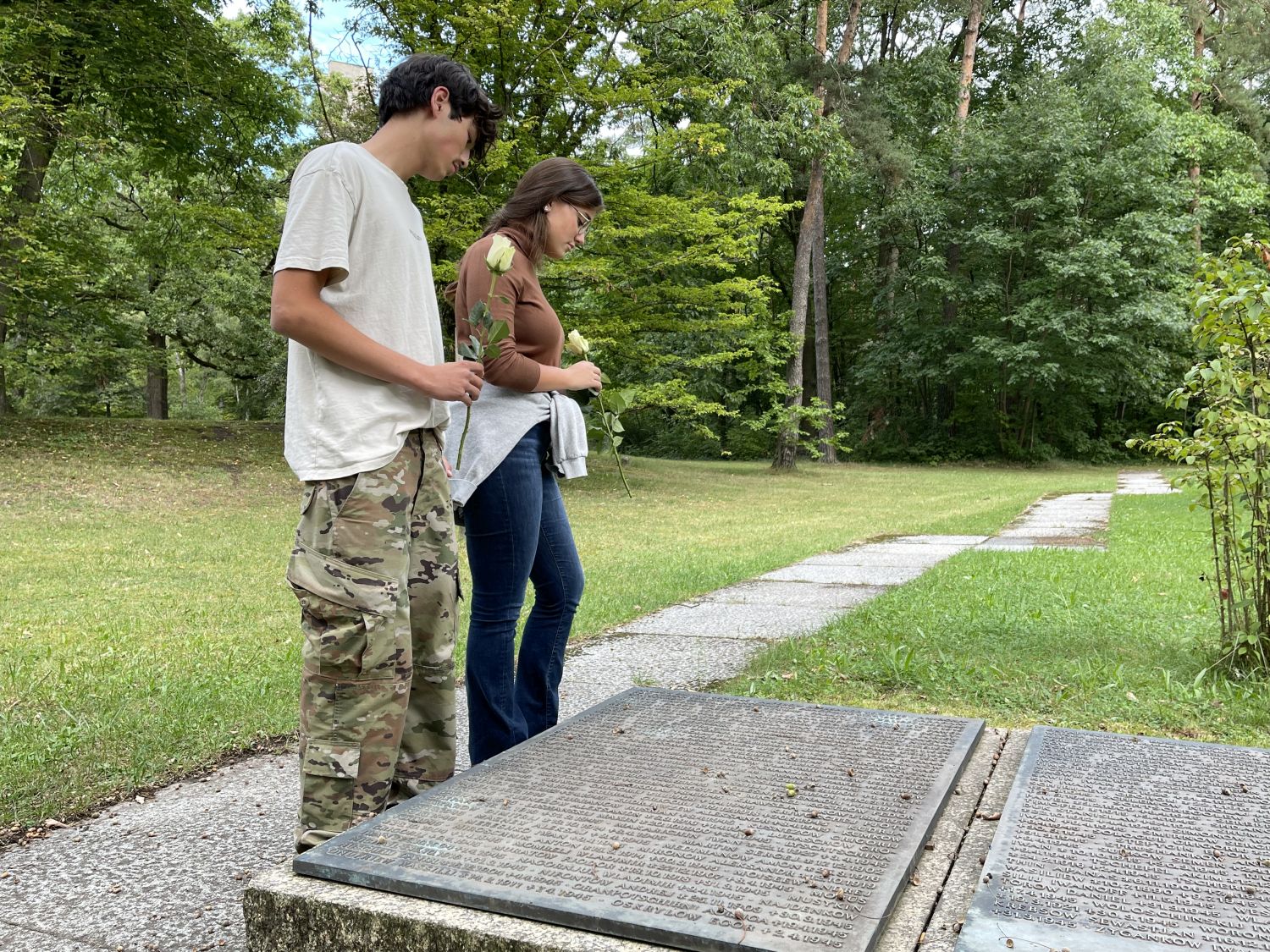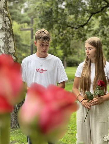 Nach dem Besuch im „Memorium“ macht sich die Gruppe auf den Weg zum Nürnberger Südfriedhof. Dort ruhen Kriegstote aus beiden Weltkriegen, darunter Opfer der nationalsozialistischen Verfolgung und Vernichtung: über 5.000 Zwangsarbeiter und Zwangsarbeiterinnen aus Süd- und Osteuropa sowie 3.500 sowjetische Kriegsgefangene. Die jungen Menschen erkunden die Kriegsgräberstätte, entziffern Namen auf verwitterten Grabsteinen. Zum Abschluss versammelt sich die Gruppe: Bartek und Antonina lesen im Wechsel das Totengedenken. Dann legt jeder eine Rose nieder – ein stiller Gruß am Grab eines Menschen, gestorben durch Unterversorgung im Lager Langwasser, durch die Folgen der Ausbeutung in der Zwangsarbeit, durch Bomben oder Erschießungen.