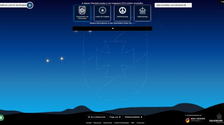 Auch ein neues Sternbild für Bundeswehr und Reserve ist am virtuellen Himmel erschienen, das der Volksbund in Kooperation mit dem Reservistenverband eingerichtet hat. Wer einen Angehörigen vermisst, einen Freund, eine Freundin, eine Kameradin oder einen Kameraden, ist eingeladen, einen Stern aufgehen zu lassen und das Gedenken und die Erinnerung so mit anderen zu teilen – verbunden mit einer Spende für die Volksbund-Arbeit: Lichter der Ewigkeit