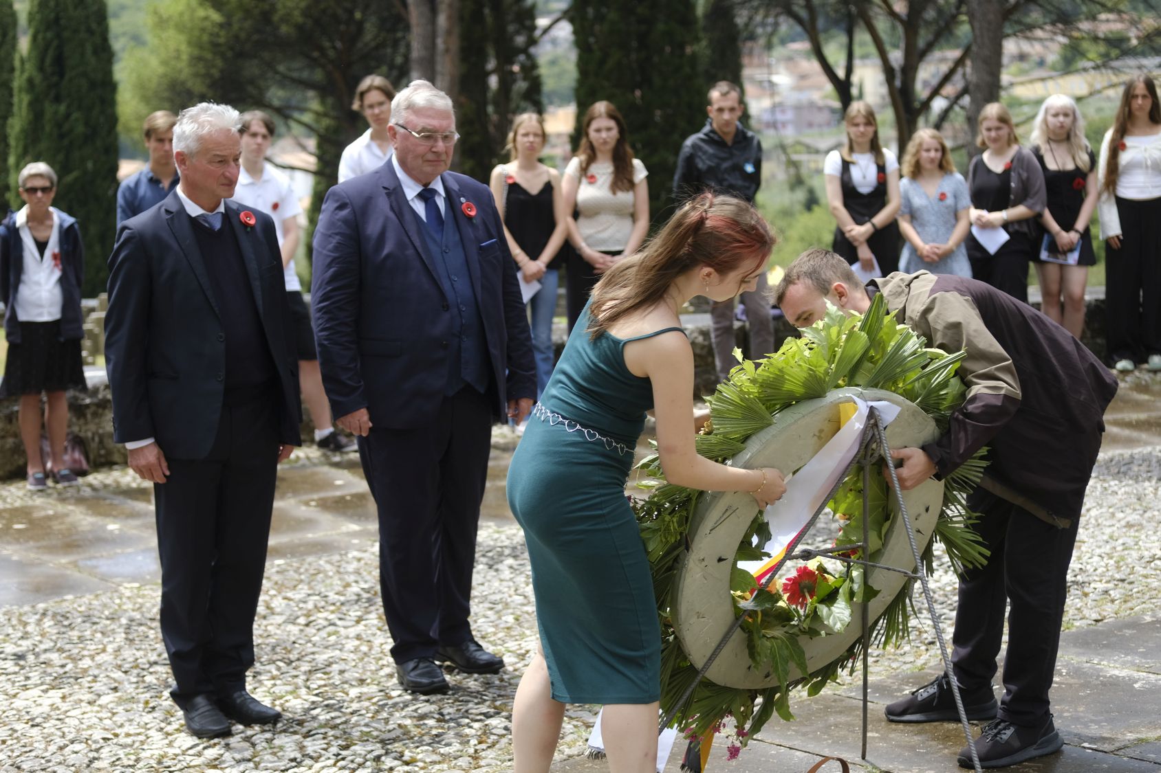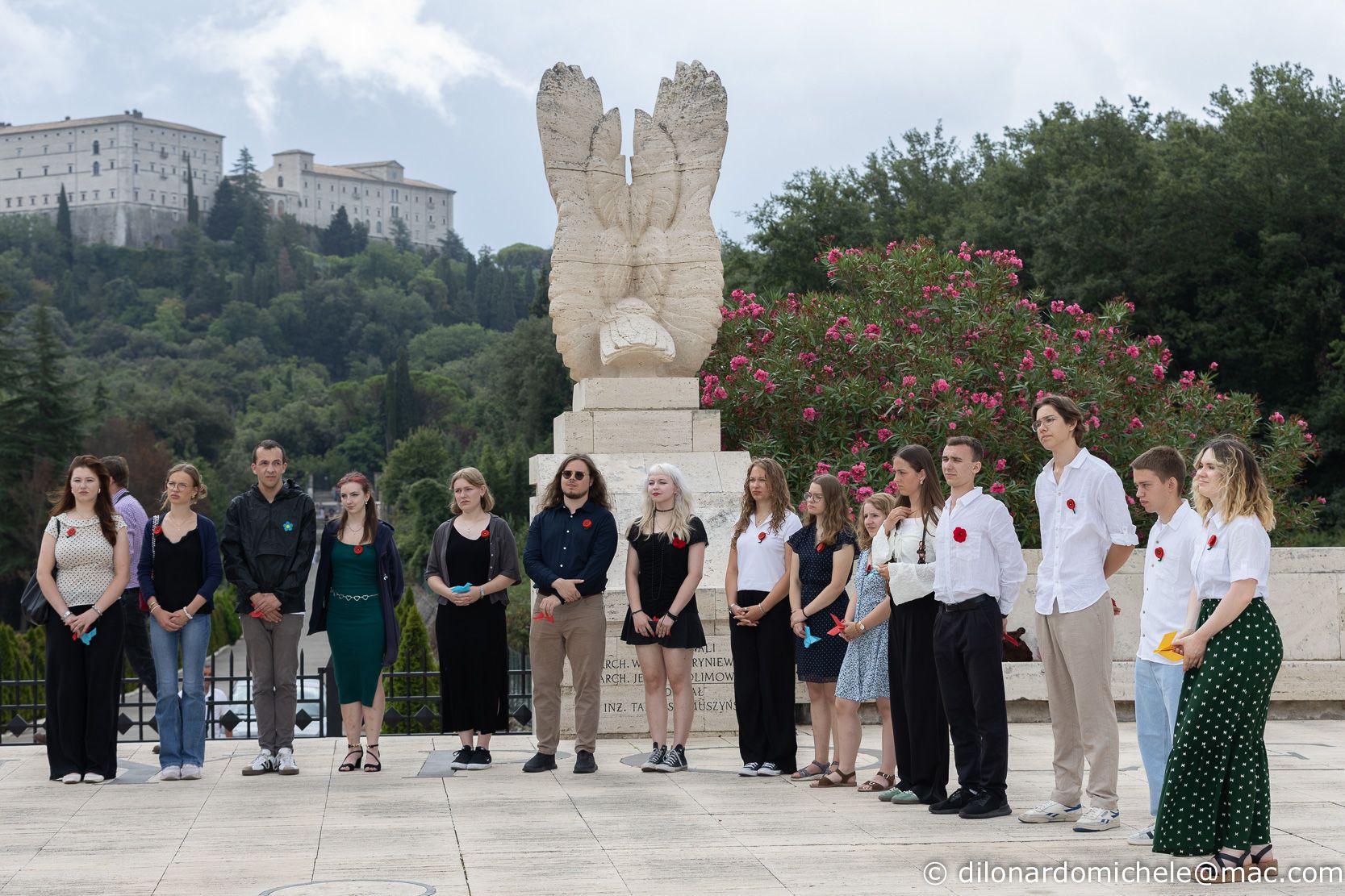 Vor eindrücklicher Kulisse: Jugendliche des deutsch-polnischen Workcamps legen auf der polnischen Kriegsgräberstätte in Cassino Kränze nieder. (© Michele Di Lonardo / Monte Cassino Stiftung)