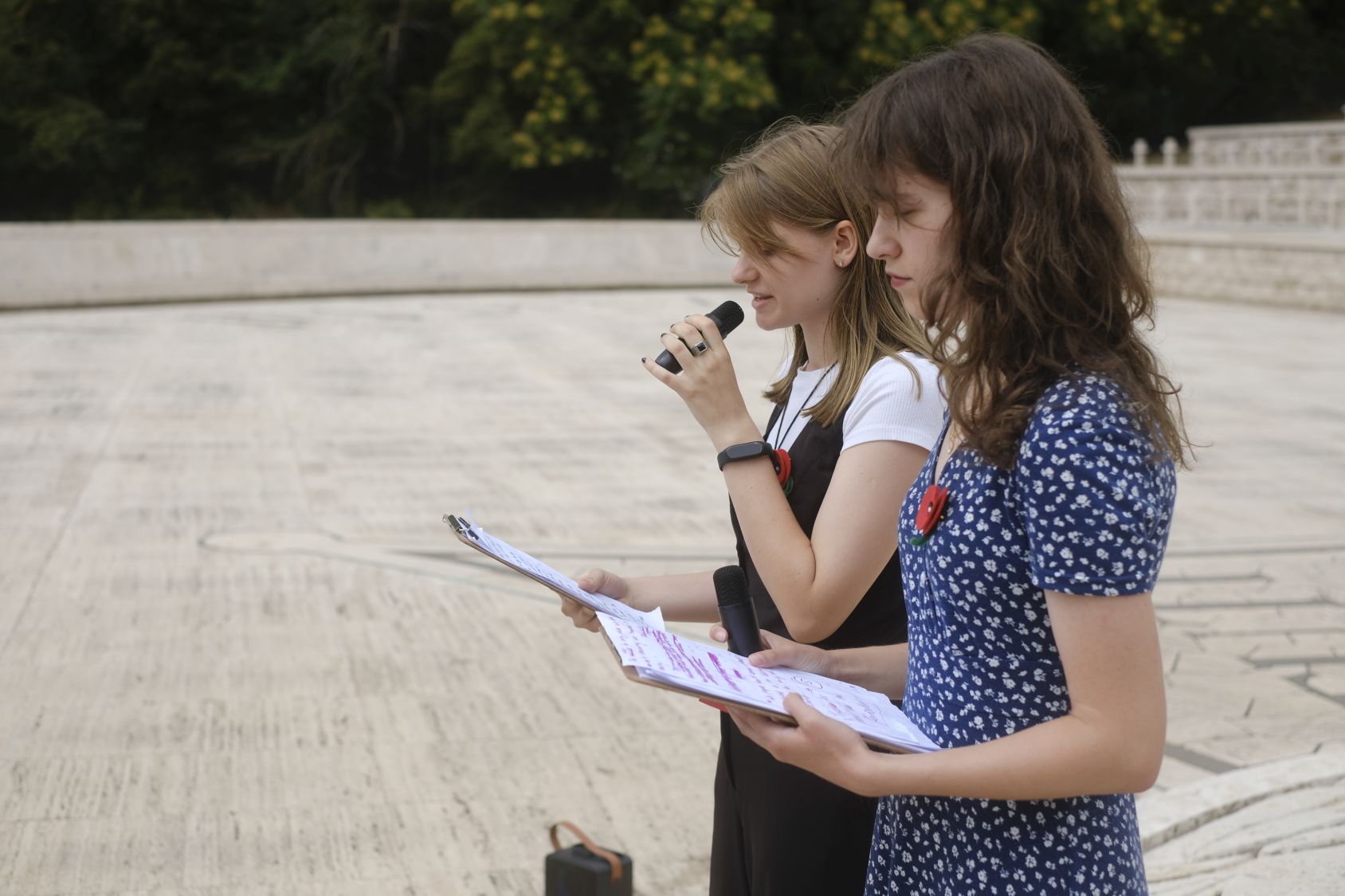 28. Juli 2025, zwei Stunden vor der Gedenkveranstaltung: Die Gruppe trifft sich zu einer schnellen Generalprobe, aber auf dem tristen Beton des Hinterhofs will nicht die richtige Stimmung aufkommen. Es fallen ein paar scharfe Worte, die Anspannung ist mit Händen zu greifen. Texte werden ein letztes Mal eingesprochen, Worte gestrichen, andere hinzugefügt, ein letzter, ernster, prüfender Blick in den Schminkspiegel.
