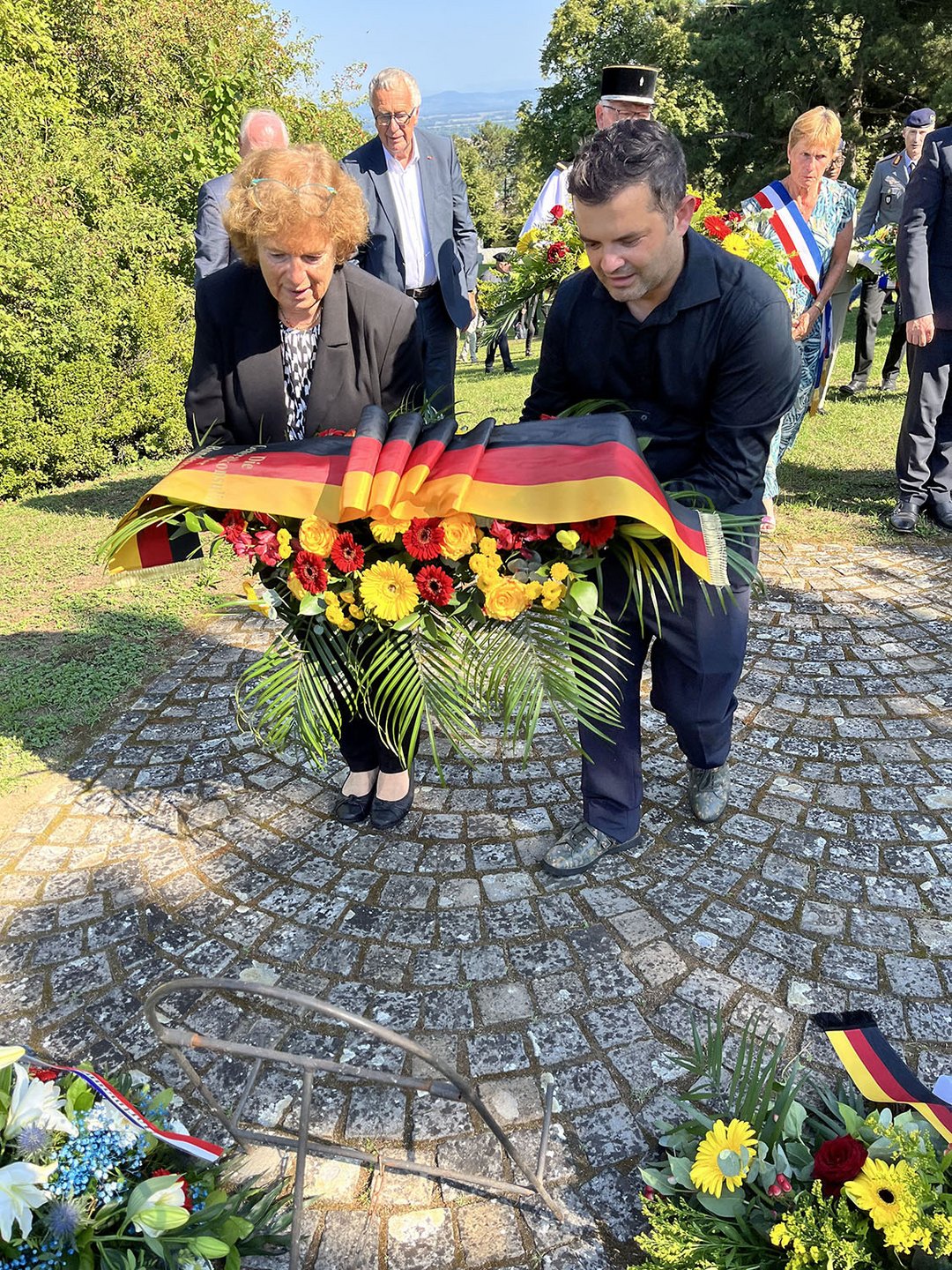 Monsignore Bernward Mezger vom Katholischen Militärpfarramt Müllheim fand einfühlsame Worte, mit denen er die Trauer um die Gefallenen, das Leid der Familien, das unausgesprochene Leid der Überlebenden umriss. Auch mit dem Totengedenken, gesprochen von Elisabeth Schneider und Guido Wolf, entstand ein Moment tiefer Verbundenheit zwischen beiden Nationen.