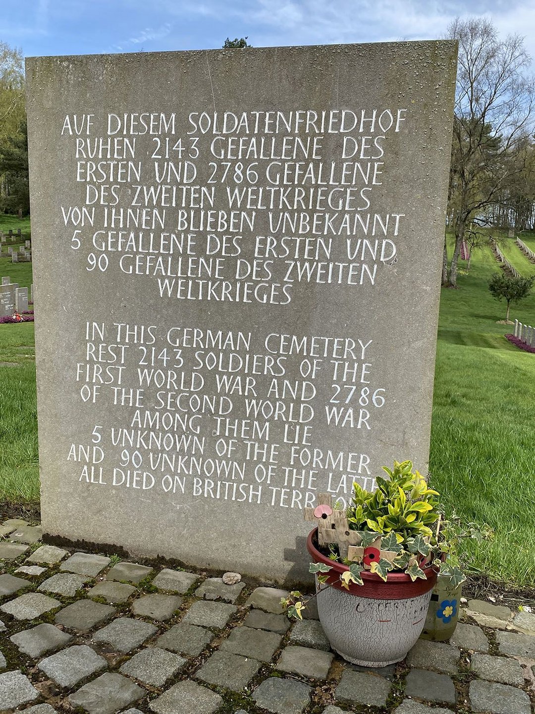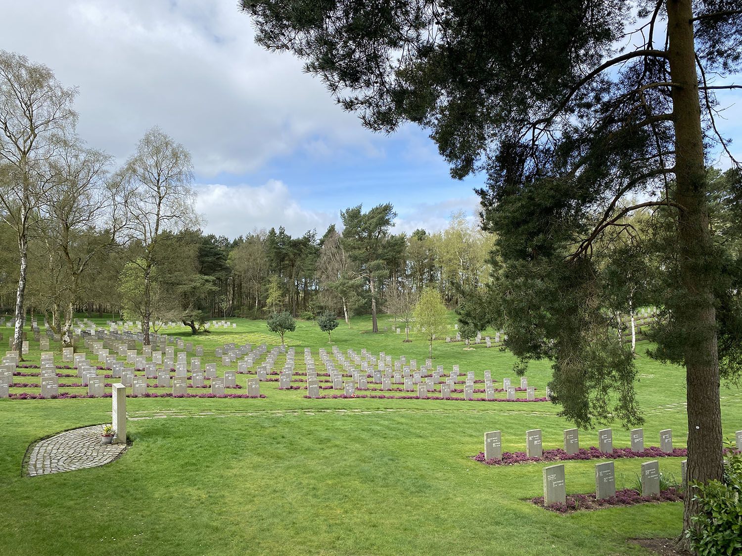 Ich lese die englischen Inschriften und verstehe sofort, was Grady meint: Es ist ein durch und durch britischer Ort mitten in Deutschland, zwischen Autobahn und Feldflur. Überall auf der Welt sehen die britischen Soldatenfriedhöfe genau so aus – von Form, Material und Beschriftung der Grabsteine bis zur Bepflanzung der Grabreihen. In jedem Land sind sie auf den ersten Blick zu erkennen.